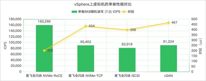 搭建一台 32 核 64GB 内存的测试虚拟机,进行单卷单并发性能测试。结果显示:vSAN ESA 最低写时延达 494 微秒,而星飞全闪块最低写时延仅 156 微秒 。这表明该数据充分证明星飞全闪更适配时延敏感型业务(如核心订单数据库)。