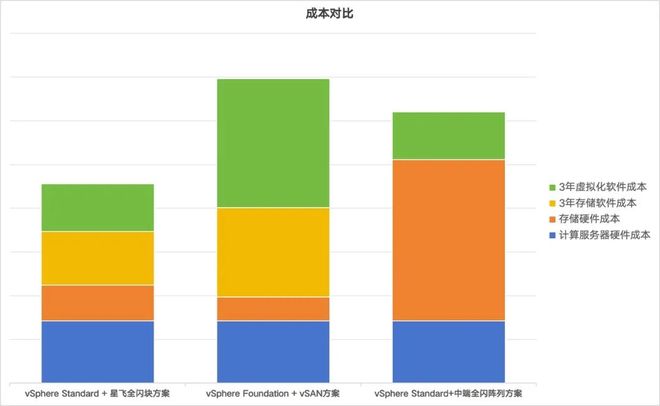在需要 368TiB 可用容量(使用 EC/RAID6,不开启压缩)的情况下,“vSphere Standard +星飞全闪块”方案的成本是三者中最低的。和 vSAN 方案相比,成本降低了 35%;和全闪阵列相比,成本降低了 26%,优势很明显。