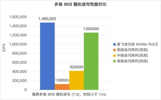 客户进一步将星飞全闪与现有国际知名品牌全闪阵列展开测试对比,结果显示:星飞全闪性能达中端全闪阵列的 3.5 倍。依托 “软硬件协同解锁” 能力,星飞全闪可在成本更低的通用硬件上,释放更强性能潜力。