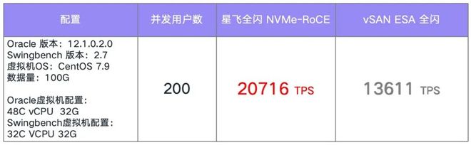 针对 Oracle 12C 数据库的实测数据显示:星飞全闪块支撑的数据库 TPS(事务处理能力)达 vSAN 的 1.5 倍,核心业务处理效率显著提升。