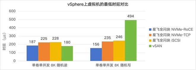 搭建一台 32 核 64GB 内存的测试虚拟机,进行单卷单并发性能测试。结果显示:vSAN ESA 最低写时延达 494 微秒,而星飞全闪块最低写时延仅 156 微秒 。这表明该数据充分证明星飞全闪更适配时延敏感型业务(如核心订单数据库)。