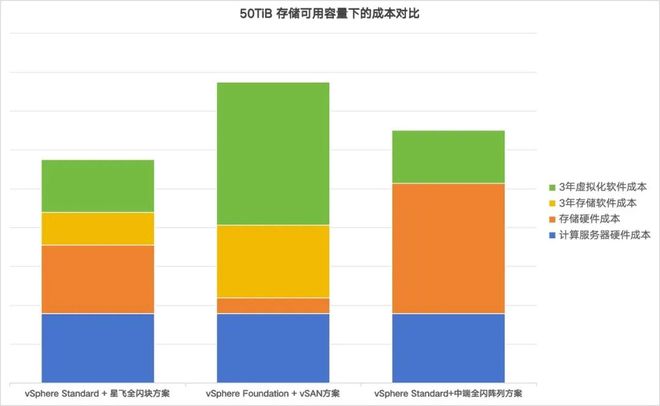 当需要 50TiB 可用容量(采用 EC/RAID6,不开启压缩)时,“vSphere Standard + 星飞全闪块”方案在这三种方案里成本最低,与vSAN 方案相比,成本降低了 25%。