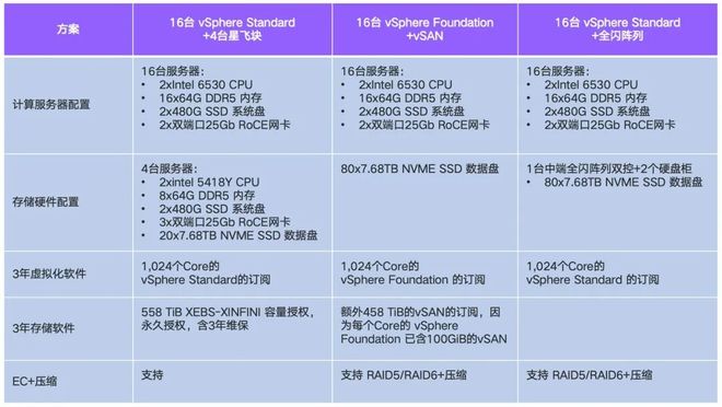 在需要 368TiB 可用容量(使用 EC/RAID6,不开启压缩)的情况下,“vSphere Standard +星飞全闪块”方案的成本是三者中最低的。和 vSAN 方案相比,成本降低了 35%;和全闪阵列相比,成本降低了 26%,优势很明显。