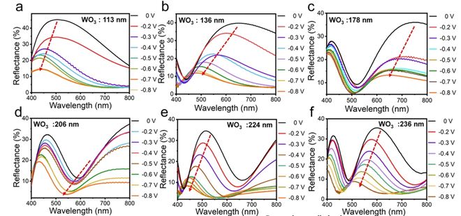 实验结果:本工作通过金属W反射层与电介质WO₃共振腔的协同设计,成功实现了无机电致变色器件(ECD)的全可见光范围(460-725nm)动态颜色调控,突破了传统无机材料仅能呈现单蓝色调的局限性。通过精确控制WO₃薄膜厚度及驱动电压,光谱峰迁移幅度最高达181nm,覆盖黄、青、紫、品红等高饱和度颜色。器件兼顾低驱动电压(-1.5~0.5V)、高着色效率(75.3cm²·C⁻¹)及长循环稳定性(1000次),尤其在柔性基底(PET)上验证了弯折稳定性,为智能窗、柔性显示等应用提供了兼具美学与功能的解决方案。